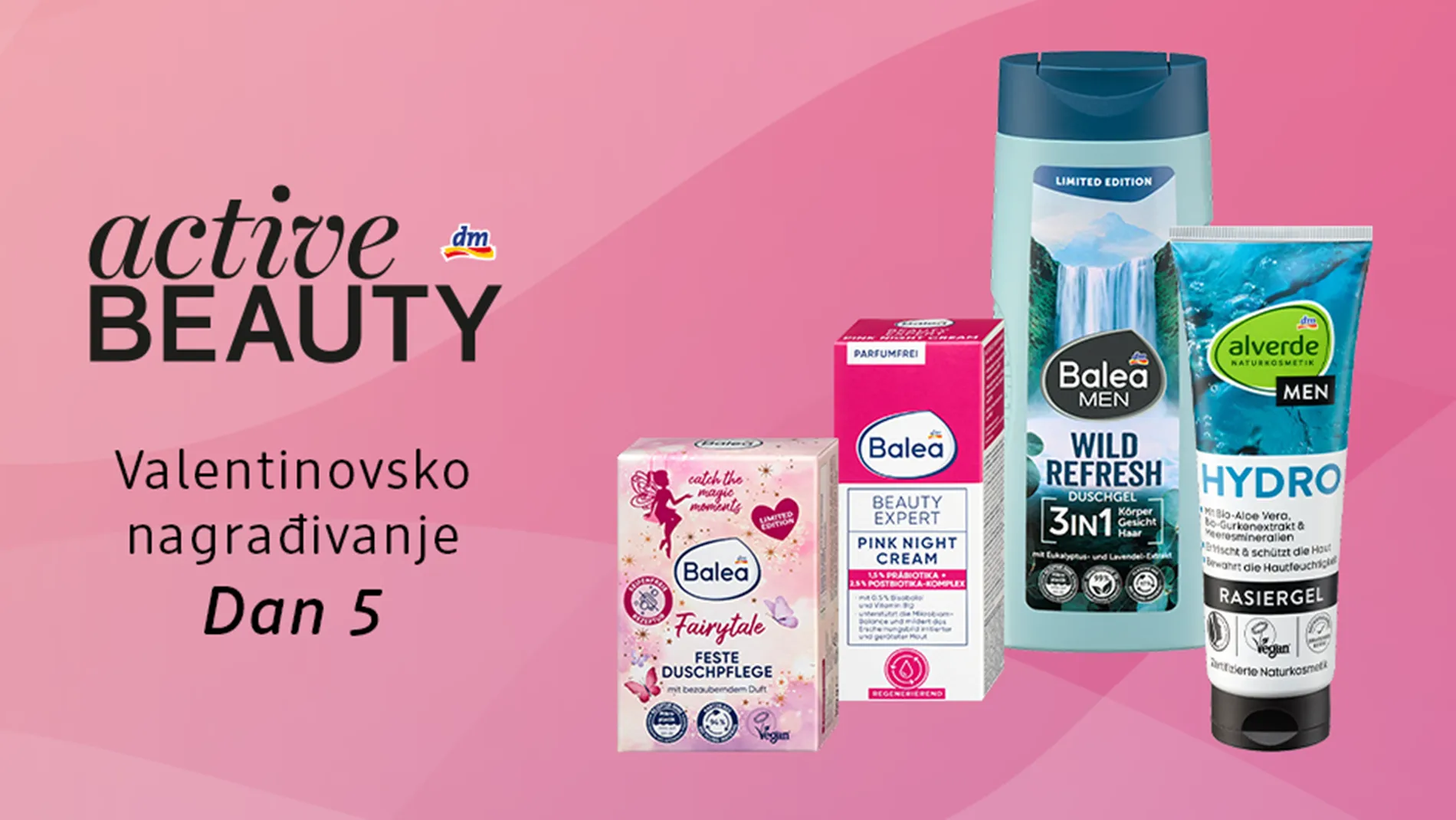 Koje osvježavajuće sastojke sadrži Balea MEN Wild Refresh 3u1 gel za tuširanje za njega, a koji sastojak u Balea Beauty Expert Pink noćnoj kremi za lice za nju djeluje na kožu umirujuće?
